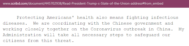 “Protecting Americans’ health also means fighting infectious diseases. We are coordinating with the Chinese government andworking closely together on the Coronavirus outbreak in China.”