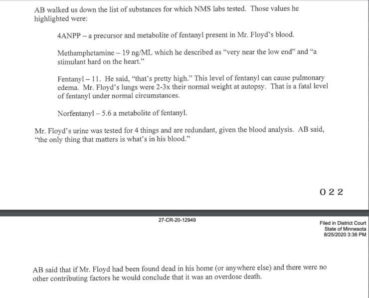 damning toxicology report that blew to smithereens the whole prosecution theory that the police had killed Floyd. To their undoubted dismay, Dr. Baker, the chief medical examiner, had to concede that at 11 ng/mL, Floyd had “a fatal level of fentanyl under normal circumstances.” He also conceded that the fentanyl overdose “can cause pulmonary edema,” a frothy fluid build-up in the lungs that was evidenced by the finding at autopsy that Floyd’s lungs weighed two to three times normal weight.