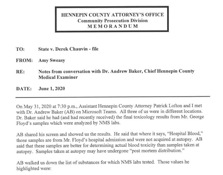 “[Baker] said that if Mr. Floyd had been found dead in his home (or anywhere else) and there were no other contributing factors he would conclude that it was an overdose death,” the memorandum stated.